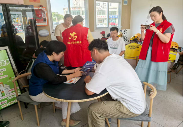 活動當天,膠州市總工會權益部、基層部的領導和九龍街道司法所的工作人員早早來到現場,耐心接待每一位咨詢者。從勞動糾紛中的薪資結算、合同簽訂,到民事侵權中的責任劃分,再到日常工作中的權益保障問題,工作人員都結合具體案例一一細致解答,還針對性地普及相關法律知識,引導大家通過合法途徑維護自身權益。現場氣氛熱烈,不少戶外勞動者帶著疑問而來,帶著清晰的解決方案滿意而歸。一位外賣小哥感慨道:“平時遇到糾紛不知道該找誰,這次驛站把律師請到家門口,問題一下子就理清楚了,太感謝了!”