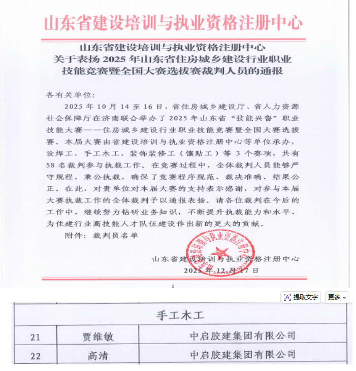近日,山東省建設培訓與執業資格注冊中心發布通報,對參與2025年山東省“技能興魯”職業技能大賽——住房城鄉建設行業職業技能競賽暨全國大賽選拔賽的裁判人員予以通報表揚。集團職工賈維敏、高清名列其中,展現了集團職工精湛的專業素養和公正嚴謹的執裁風采。