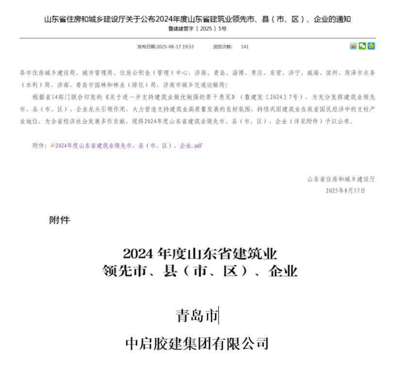 近日,山東省住房和城鄉(xiāng)建設(shè)廳正式公布2024年度山東省建筑業(yè)領(lǐng)先市、縣(市、區(qū))、企業(yè)名單,中啟膠建集團有限公司憑借卓越的綜合實力、穩(wěn)健的經(jīng)營表現(xiàn)和突出的行業(yè)貢獻,成功入選“2024年度山東省建筑業(yè)綜合實力領(lǐng)先企業(yè)”。這是繼獲評“齊魯建造”品牌后,公司本年度再度斬獲的省級重磅榮譽,標(biāo)志著企業(yè)在高質(zhì)量發(fā)展征程中邁上新臺階!